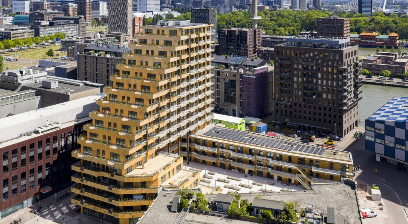 Situado en Rotterdam, incluye por primera vez paredes de madera prefabricadas de la marca