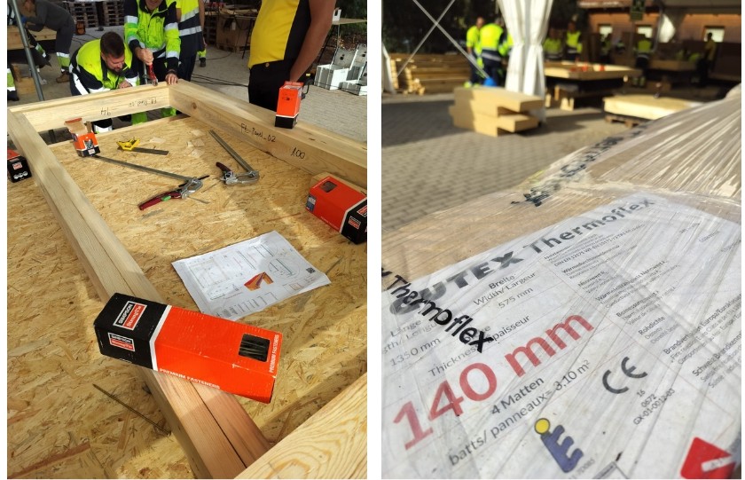 En esta formación práctica, aparte de madera de Sonae, se han utilizado materiales procedentes de otros socios de Club Madera, como tornillería especializada de Simpson Strong-Tie, aislamientos de la marca Gutex de Biohaus y herramientas de corte de Mafell.