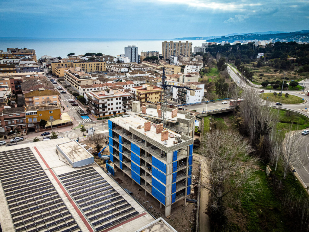 Promovido por Sostre Civic, avanzan las obras de un edificio de 34 viviendas sociales y cooperativas Palamós (Girona). El inmueble presenta una construcción mixta que combina una estructura de hormigón y cierres de fachada de entramado ligero de madera, con aislamiento de fibra de madera.