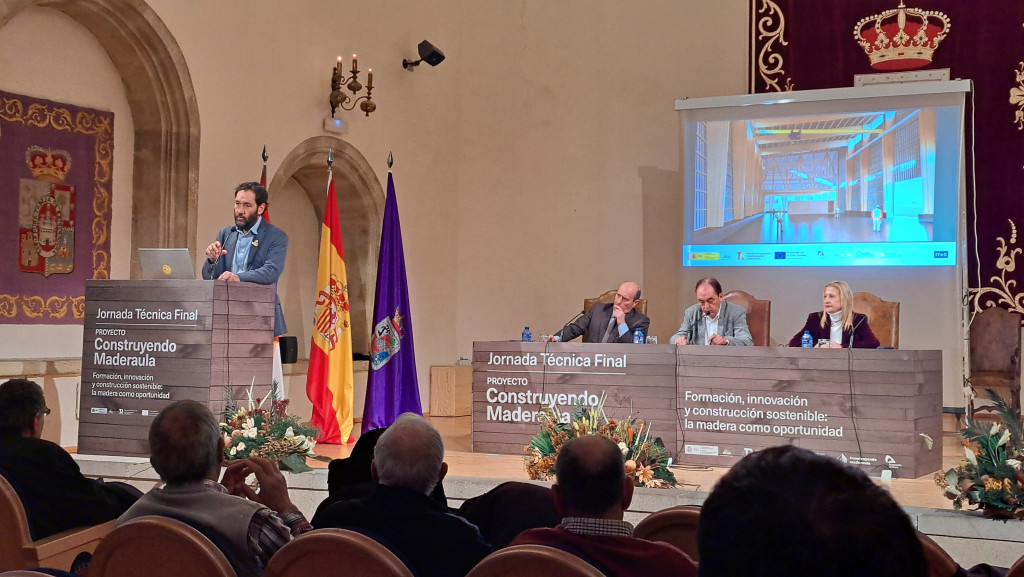 El 16 de diciembre tuvo lugar la jornada final del proyecto Construyendo Maderaula. Una excelente oportunidad para conocer el gran trabajo desarrollado durante los últimos meses por todos sus socios. El aula magna Tirso de Molina de la Diputación Provincial de Soria acogió la presentación de los resultados técnicos. La mesa inaugural contó con la participación de Benito Serrano (presidente de la Diputación de Soria), Pedro Martín López (coordinador de relaciones agrarias de la Subdelegación del Gobierno en Soria) y Yolanda de Gregorio (delegada territorial de la Junta de Castilla y León).