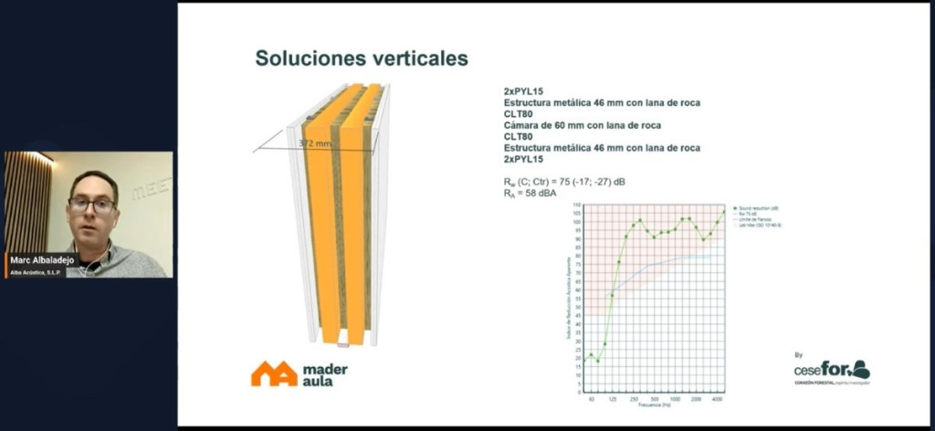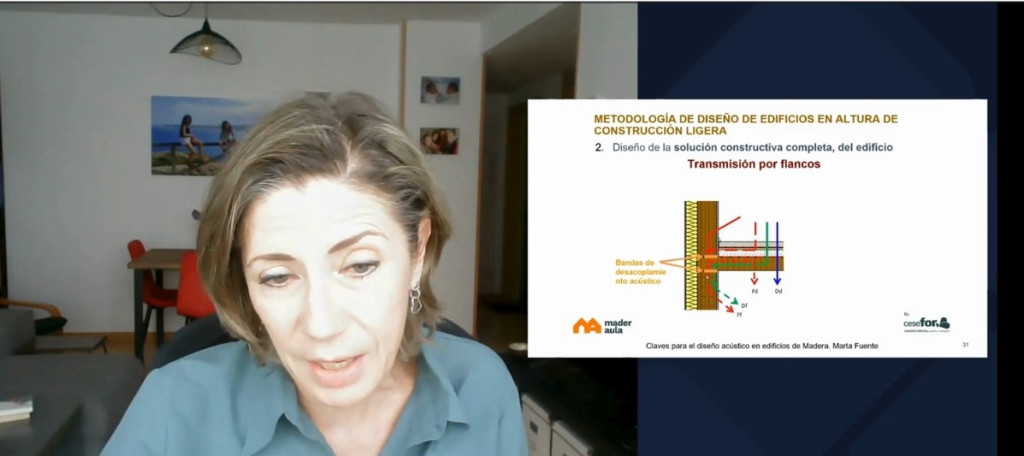 El webinar, que modera Irene Jimeno (Toca Madera Sounds Wood), con la colaboración de Manuel García Barbero, responsable de construcción con madera de Cesefor, comenzó con una ponencia de la experta en construcción industrializada y acústica de la edificación, Marta Fuente, de Tecnalia, quien explicó las claves para el diseño acústico en edificios de madera. Además de mostrar las propiedades acústicas de este material, presentó diversas soluciones constructivas y estrategias de diseño.