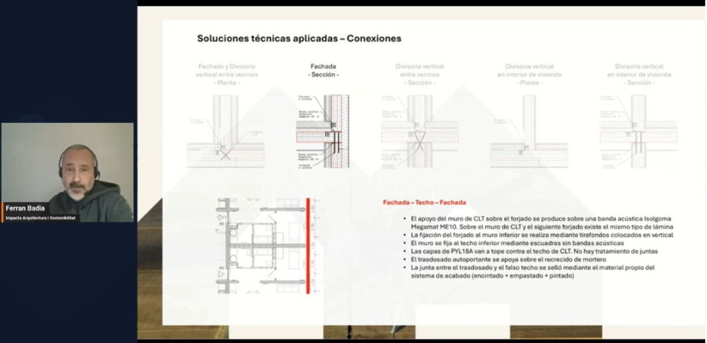 A continuación Marc Albaladejo, gerente de Alba Acústica, realizó una presentación prácticas sobre soluciones viables y prácticas, aptas para el CTE DB-HR, con las que obtener buen comportamiento acústico en edificios de madera CLT. Finalmente, el arquitecto Ferran Badia mostró las soluciones aplicada en un caso real: un edificio de 56 viviendas con estructura CLT en Barcelona.