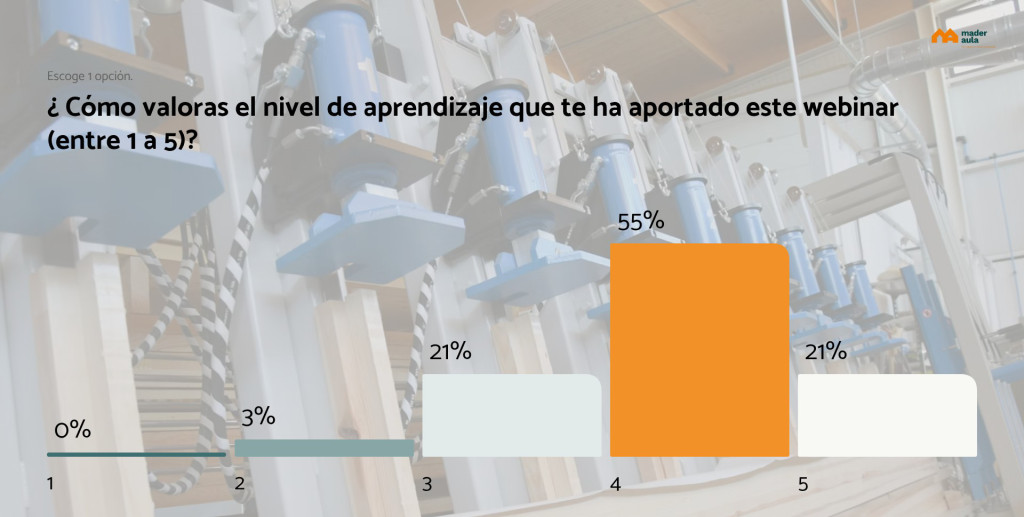 Con un perfil de participación del 60% de arquitectos, ingenieros y constructores y un 27% de consultores e investigadores entre las conclusiones principales destaca que dos de cada tres asistentes contaba con experiencia en construcción con madera. El 75% de los participantes valoró como alto o muy alto el nivel de aprendizaje adquirido en esta sesión.