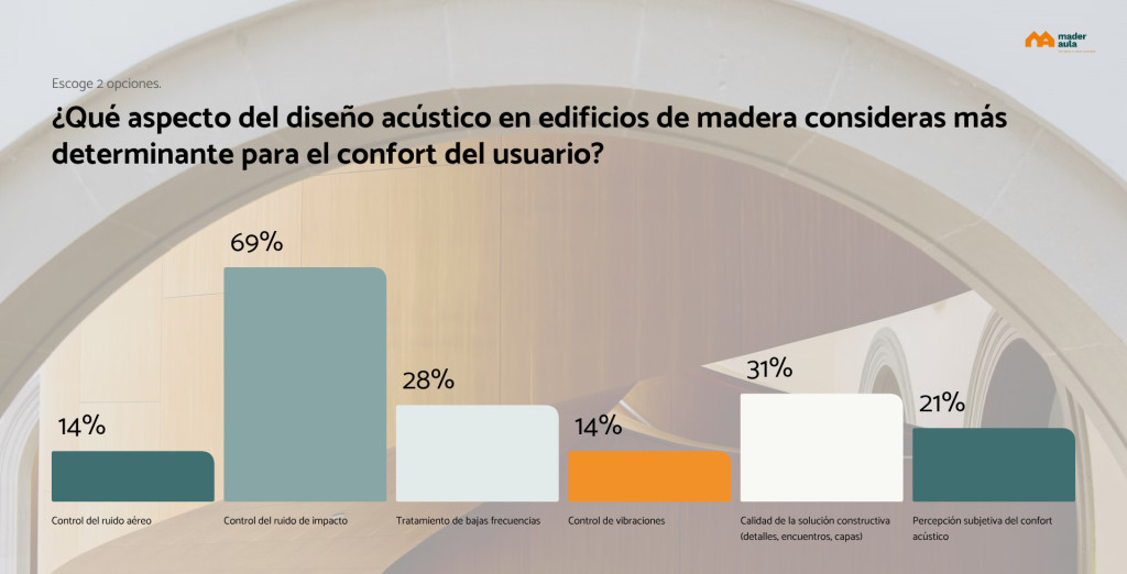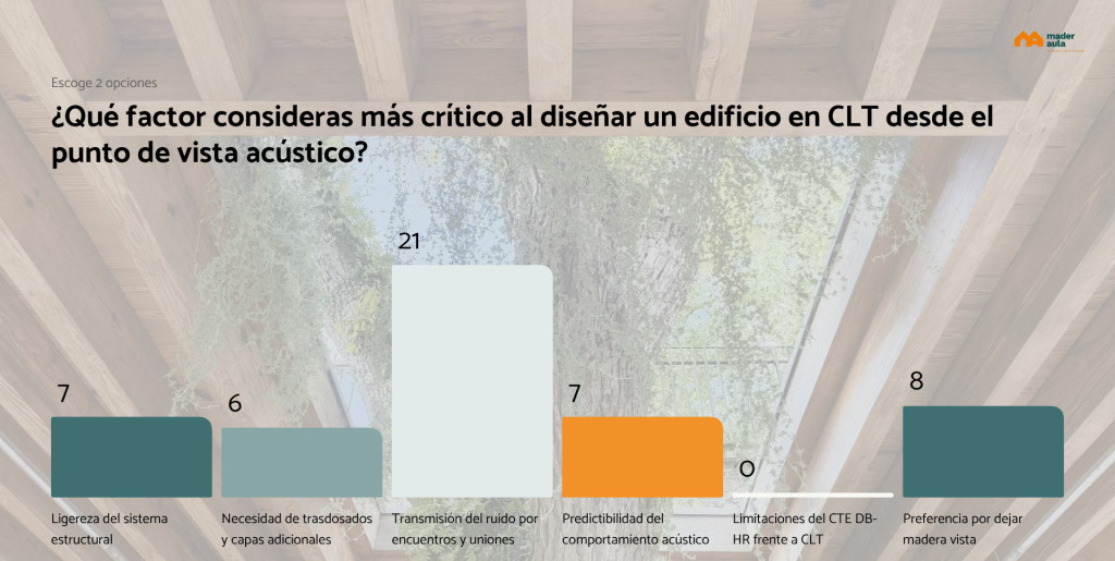 En cuanto a la propia temática, una amplia mayoría, el 70% considera el control del ruido de impacto como el aspecto del diseño acústico más determinante del usuario. Hubo consenso también en que la transmisión del ruido por encuentros y uniones es el factor más crítico, desde el punto de vista acústico, a la hora de diseñar un edificio de CLT.
