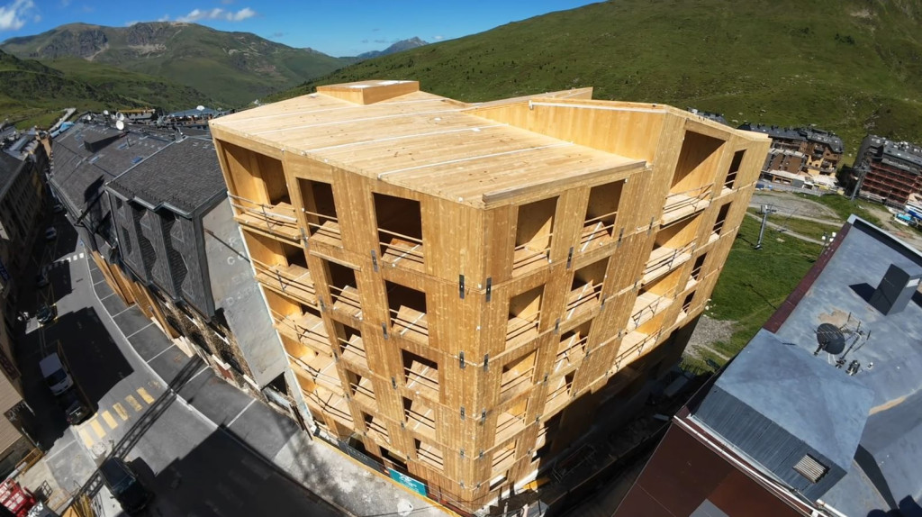 Acaba de finalizar la construcción de la estructura de un edificio de 6 plantas y 17 metros de altura en Pas de la Casa (Andorra la Vella). Levantada mediante sistema de construcción industrializada con madera CLT de Egoin, ha sido ejecutada en solo dos meses.