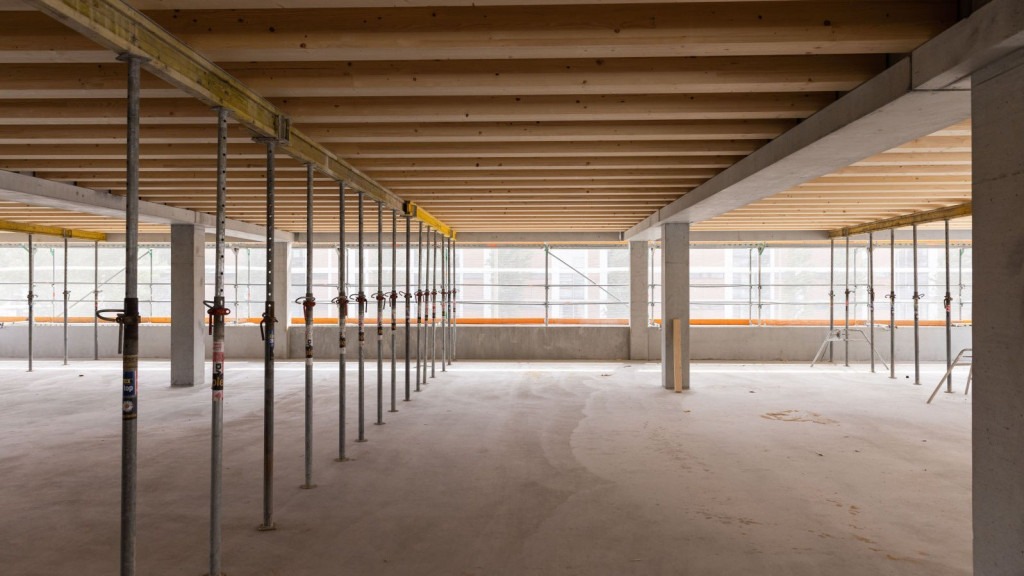 Desde el punto de vista estructural, la solución híbrida permite reducir el espesor del hormigón y el peso propio del edificio, optimizando el consumo de material y disminuyendo la huella de carbono. La madera, además de actuar como elemento resistente, funciona como almacén de carbono, contribuyendo a la estrategia de descarbonización del sector.