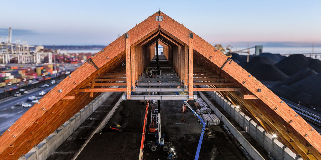 La instalación cuenta con impresionantes vigas curvadas de madera laminada encolada (Glulam) de 50 metros, una luz de 71 metros y una superficie de poco menos de 2.8 hectáreas.