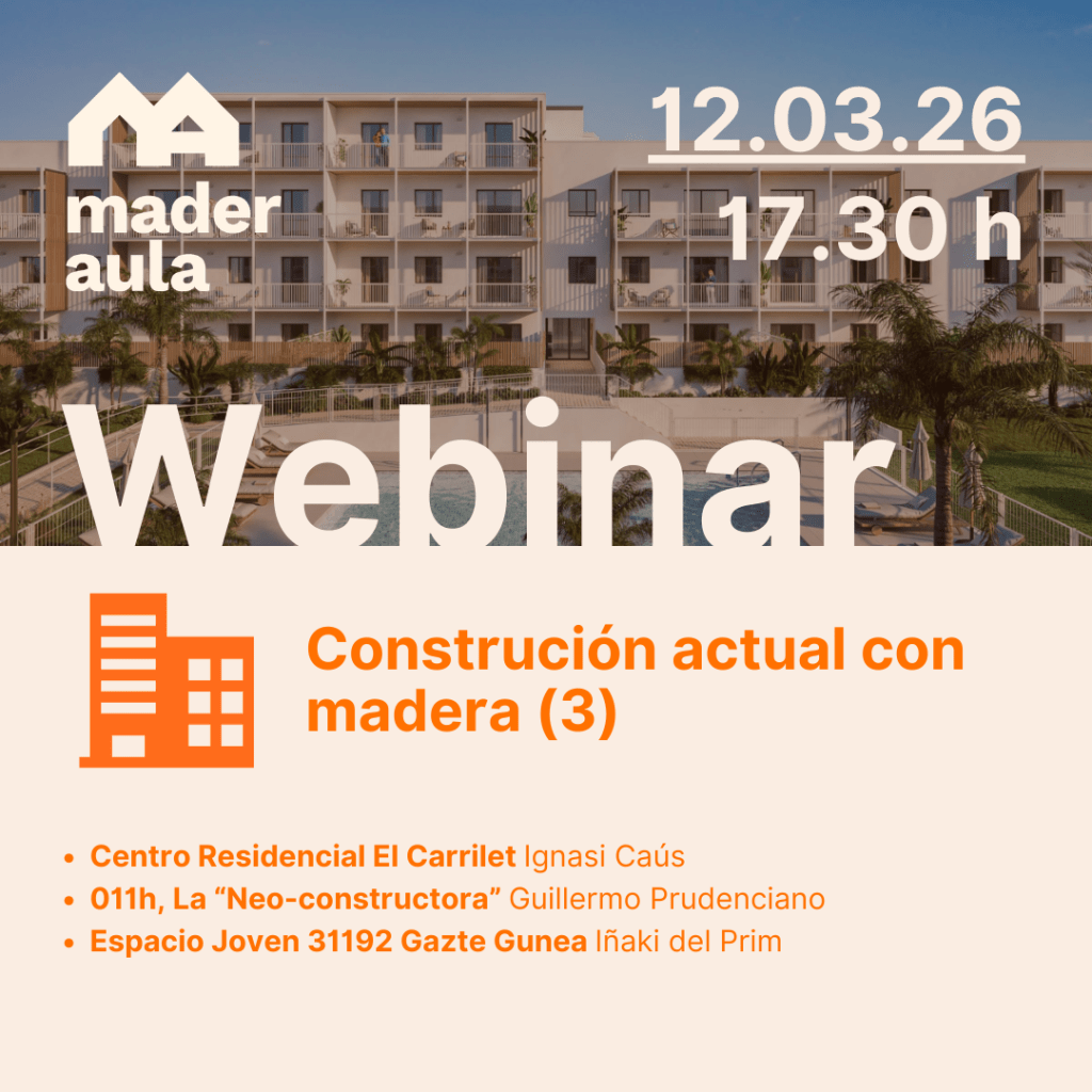 En el decimoquinto Maderaula Webinar, y tercero correspondiente al bloque “Construcción actual con madera”, presentamos tres interesantes propuestas: El Centro Residencial El Carrilet, obra de Tall Fusta en Basareny (Barcelona), el concepto “neo-constructora” aplicado por 011h y el proyecto Espacio Joven 31192 Gazte Gunea, en el Valle de Araguren (Navarra)